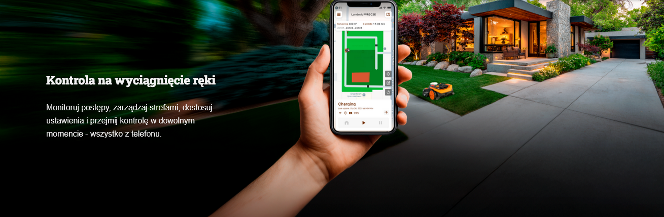 Łączność Wi-Fi umożliwia także błyskawiczne przesyłanie danych do chmury Worx, co przekłada się na pełną kontrolę nad urządzeniem w czasie rzeczywistym. Aplikacja automatycznie wysyła powiadomienia push w przypadku wykrycia przeszkody, przerwania pracy, zmiany trybu koszenia lub wystąpienia błędu systemowego. Pozwala to użytkownikowi natychmiast reagować na każdą sytuację i zachować maksymalne bezpieczeństwo robota.