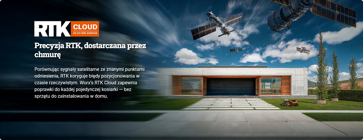 RTK Cloud Worx to zaawansowany system lokalizacji, który wprowadza roboty koszące Worx Landroid Vision Cloud na zupełnie nowy poziom precyzji. Technologia oparta na pozycjonowaniu satelitarnym GPS oraz korektach RTK (Real Time Kinematic) przesyłanych w czasie rzeczywistym przez chmurę Worx umożliwia określanie położenia robota z dokładnością nawet do kilku centymetrów. Wszystko odbywa się bez konieczności montażu zewnętrznych anten czy instalowania przewodów ograniczających.